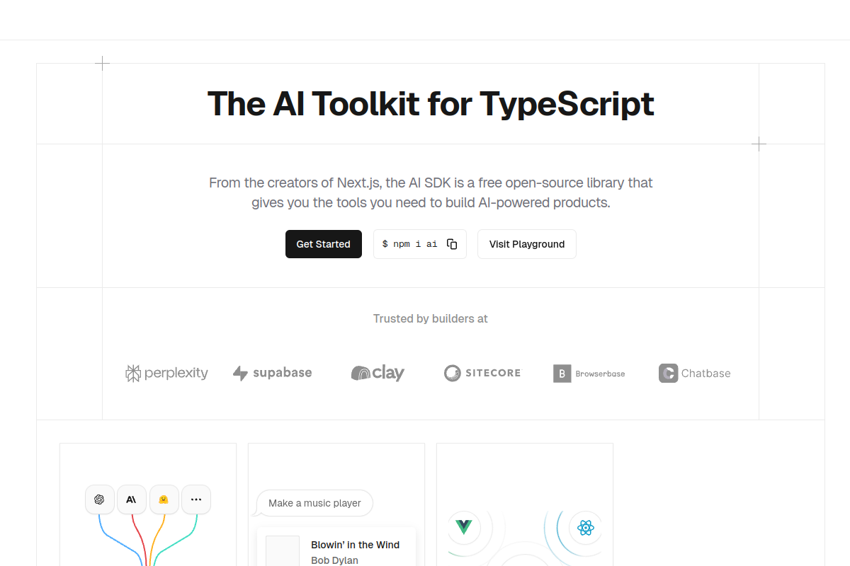 Vercel AI SDK est une bibliothèque open-source pour créer des interfaces utilisateur de texte en streaming et de chat alimentées par l'IA. Intégrez-vous de manière transparente avec OpenAI, Anthropic et d'autres fournisseurs d'IA avec le support de React, Next.js et Svelte.