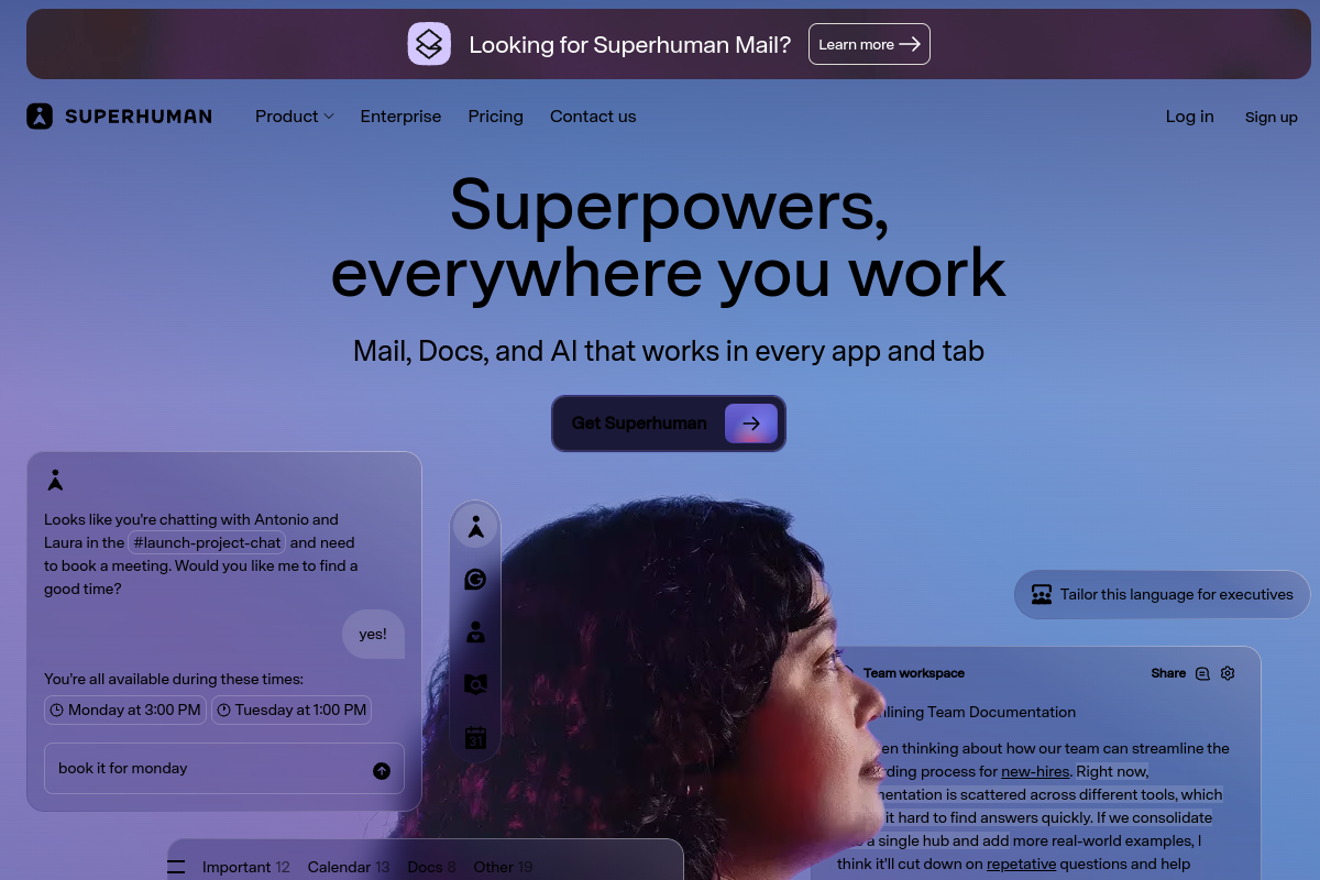 Process email twice as fast with Superhuman's blazingly fast email client enhanced with AI. Get AI-written replies, automatic email summaries, and smart inbox organization that learns your priorities. Executives manage hundreds of daily emails, sales teams respond faster, and busy professionals achieve inbox zero daily. Keyboard shortcuts and AI assistance combine to create the fastest email experience possible, turning email from a burden into a superpower.
