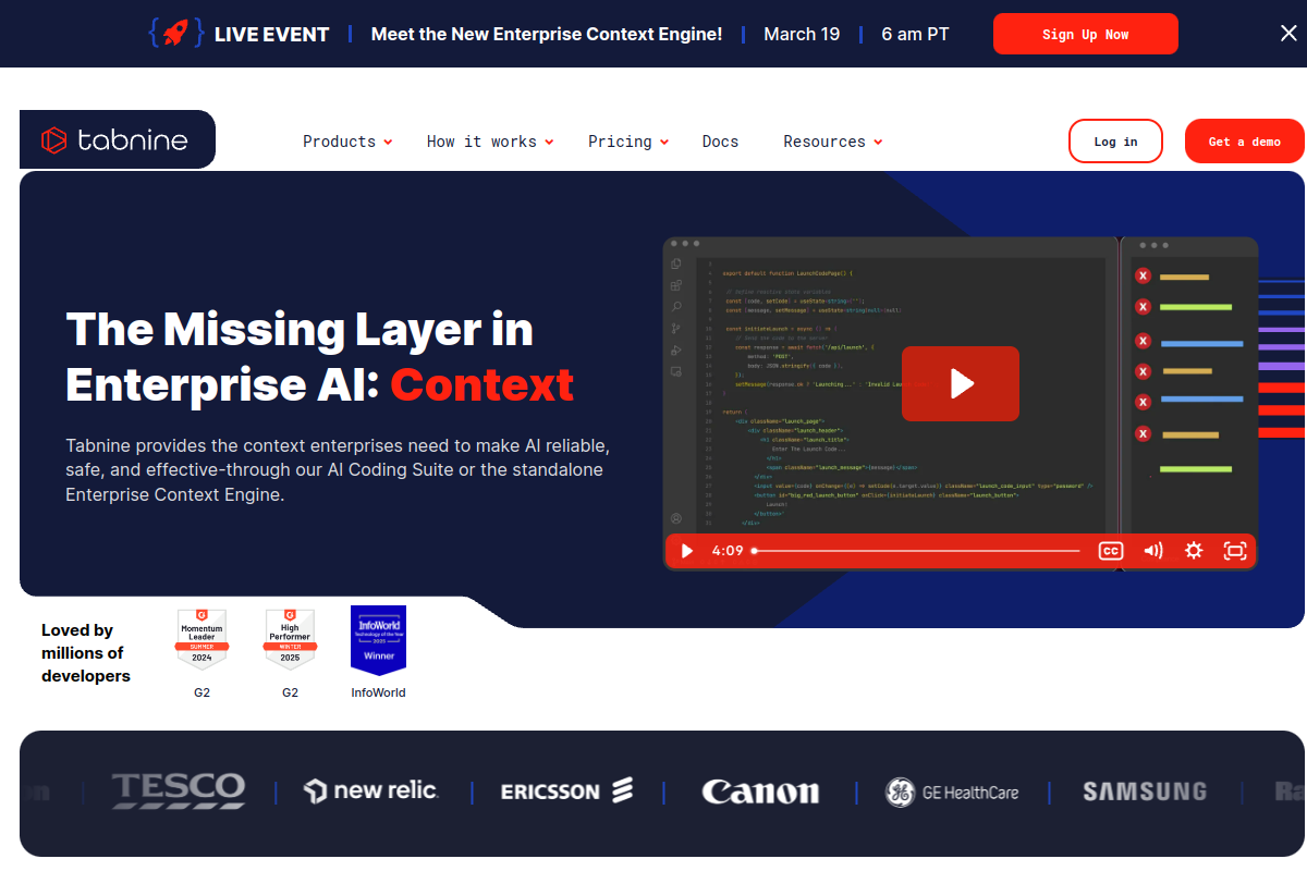 Write code faster with Tabnine's AI-powered code completions that understand your entire project context. Get whole-line and full-function suggestions as you type, trained on billions of lines of code. Developers increase coding speed by 30%, teams maintain consistent code style, and junior developers learn best practices from AI suggestions. Unlike cloud-based tools, Tabnine can run entirely on your machine, keeping your code private and secure.