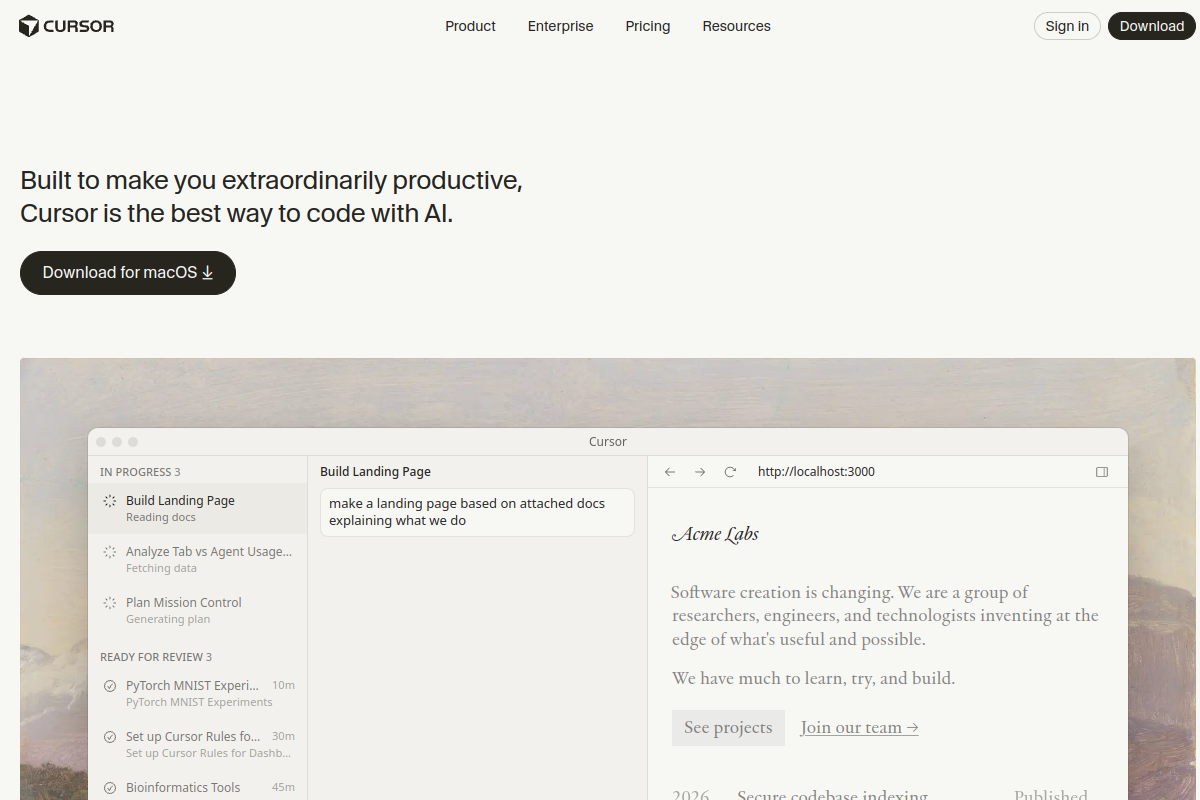 Cursor 透過將 AI 直接整合到您的編輯器中,徹底革新了編碼方式。憑藉智能自動完成功能,更快地編寫程式碼;使用自然語言指令重構整個程式碼庫;只需描述問題即可除錯。與傳統的 IDE 不同,Cursor 理解您的整個專案上下文並提供相關解決方案。開發人員交付功能的速度提升兩倍,初級工程師即時學習最佳實踐,團隊輕鬆維持一致的程式碼品質。
